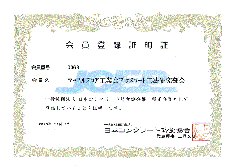 この度、当会の下部組織「プラスコート工法研究部会」が、一般社団法人 日本コンクリート防食協会(日防協)の第1種正会員となりました。
